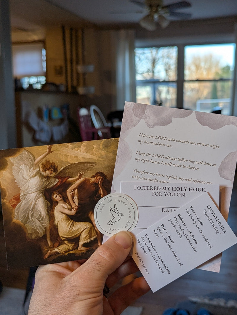A monthly snail mail subscription delivering a carefully curated envelope arrives — art, scripture, words from the saints, something to carry with you, a stranger's intention to lift to God, and more. Everything chosen to help you slow down, turn toward the Lord, and pray a little deeper.